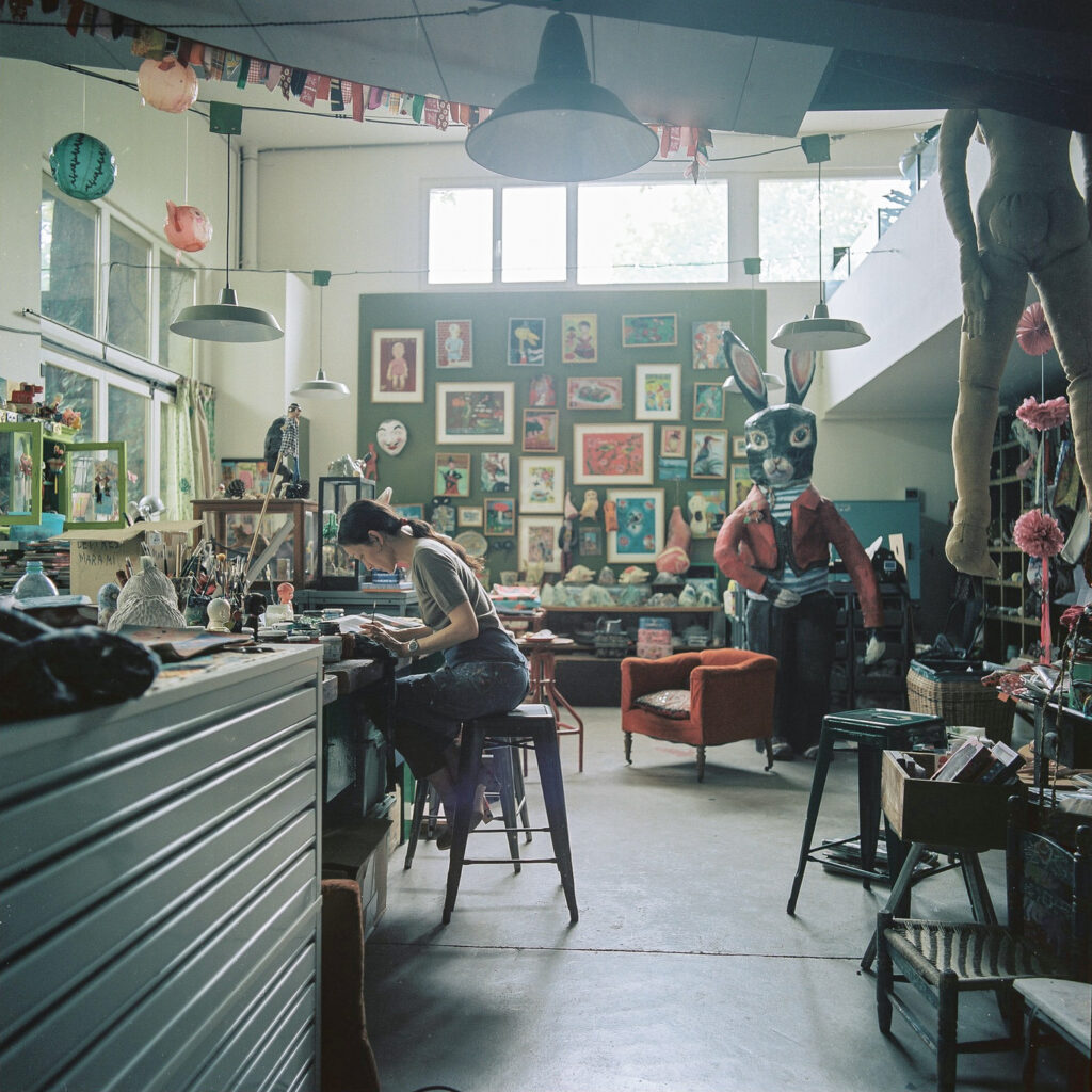 彼女の創作の源泉は、ヴィンテージ玩具、古いぬいぐるみ、花、動物彫刻、アンティーク雑貨など。