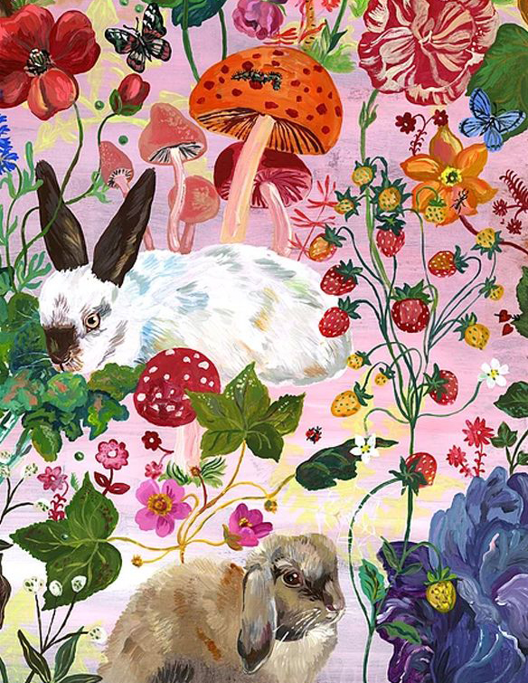 ニコリともしない表情の猫やうさぎ、画面いっぱいに飛び散る花やキノコ――。